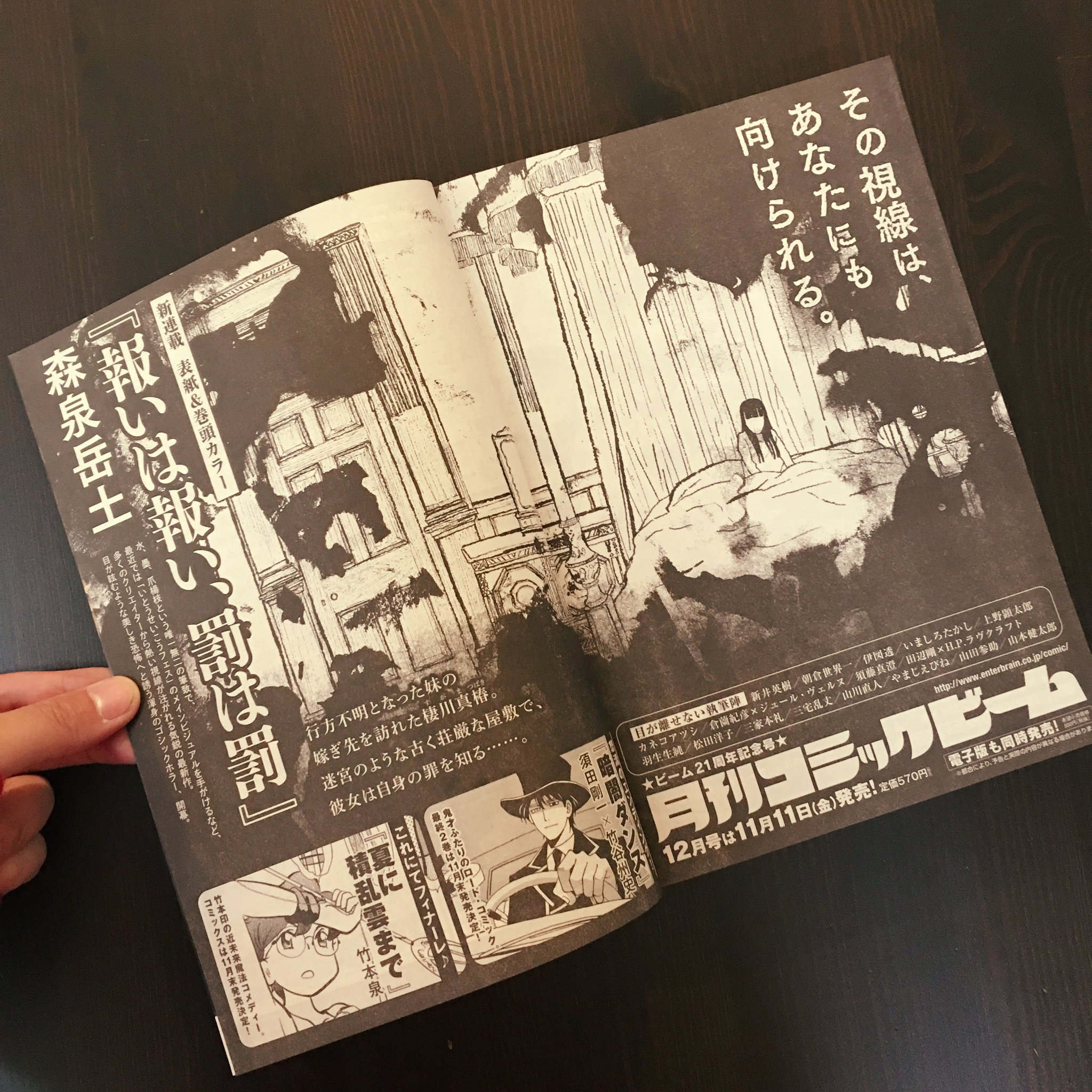 森泉岳土 Moriizumi Takehito On Twitter 昨日発売のコミックビームに予告が載りました 来月 11月号から連載がはじまります タイトルは 報いは報い 罰は罰 ちょっと怖いやつです で 予告にあるとおり 表紙 巻頭カラーを担当します はじめてです